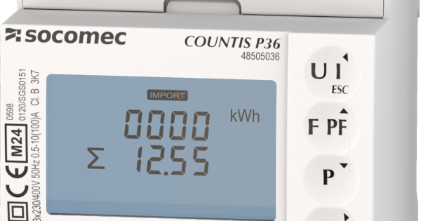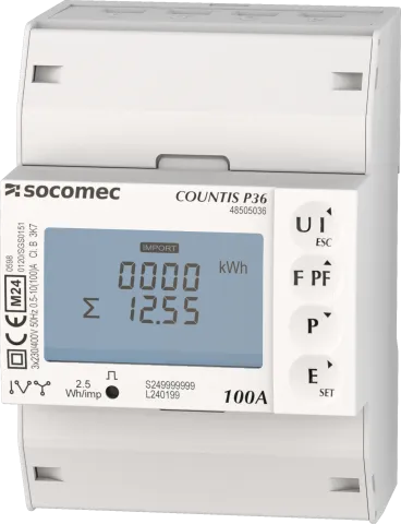 | Description | Modular active-energy meters COUNTIS P36 MID-certified Three phase - direct 100A, M-BUS type of electrical ports, fully integrated in SOCOMEC ecosystem including: Webview/screens/gateways/configuration software |
